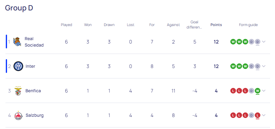 Real Sociedadi mblodhi 12 pikë nga gjashtë ndeshje, aq sa edhe Interi – por që “La Real” mori pozitën e parë për shkak të rezultateve më të mira në ndeshjet direkte.