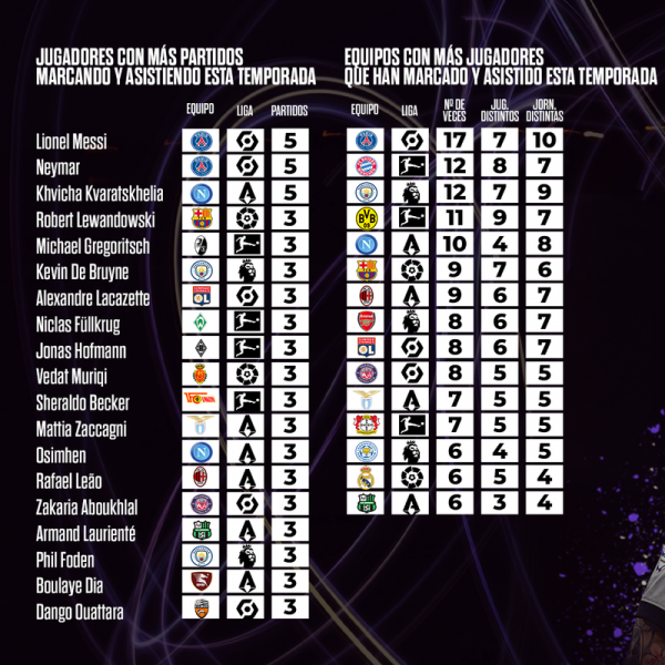 Kështu, dyshja e PSG-së, Messi e Neymar dhe lojtari i Napolit, Kvicha Kvaratskhelia kanë shënuar dhe asistuar njëkohësisht në pesë ndeshje në këtë edicion në ligat përkatëse.