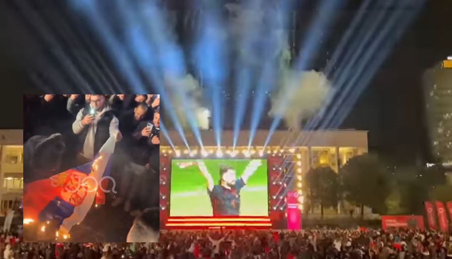 JOQ Albania publikoi pamjet ku disa persona i vunë flakën flamurit serb, djegja e cilit u përcoll me brohoritje dhe ovacione nga të pranishmit.